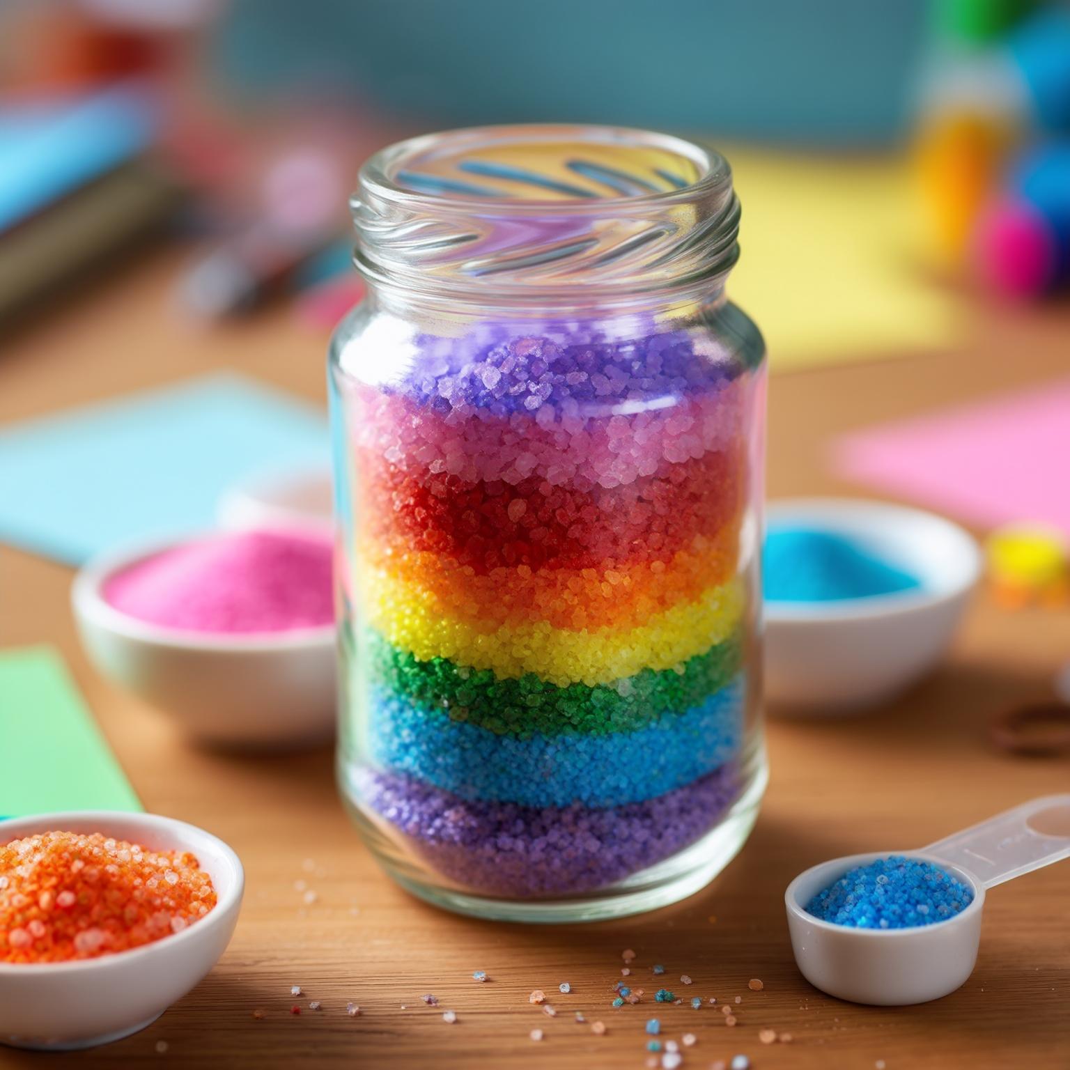 아이들도 쉽게 할 수 있는 감각적인 공예 놀이예요! 여러 가지 색깔의 소금을 층층이 쌓아 나만의 무지개 병을 만들어 보세요.